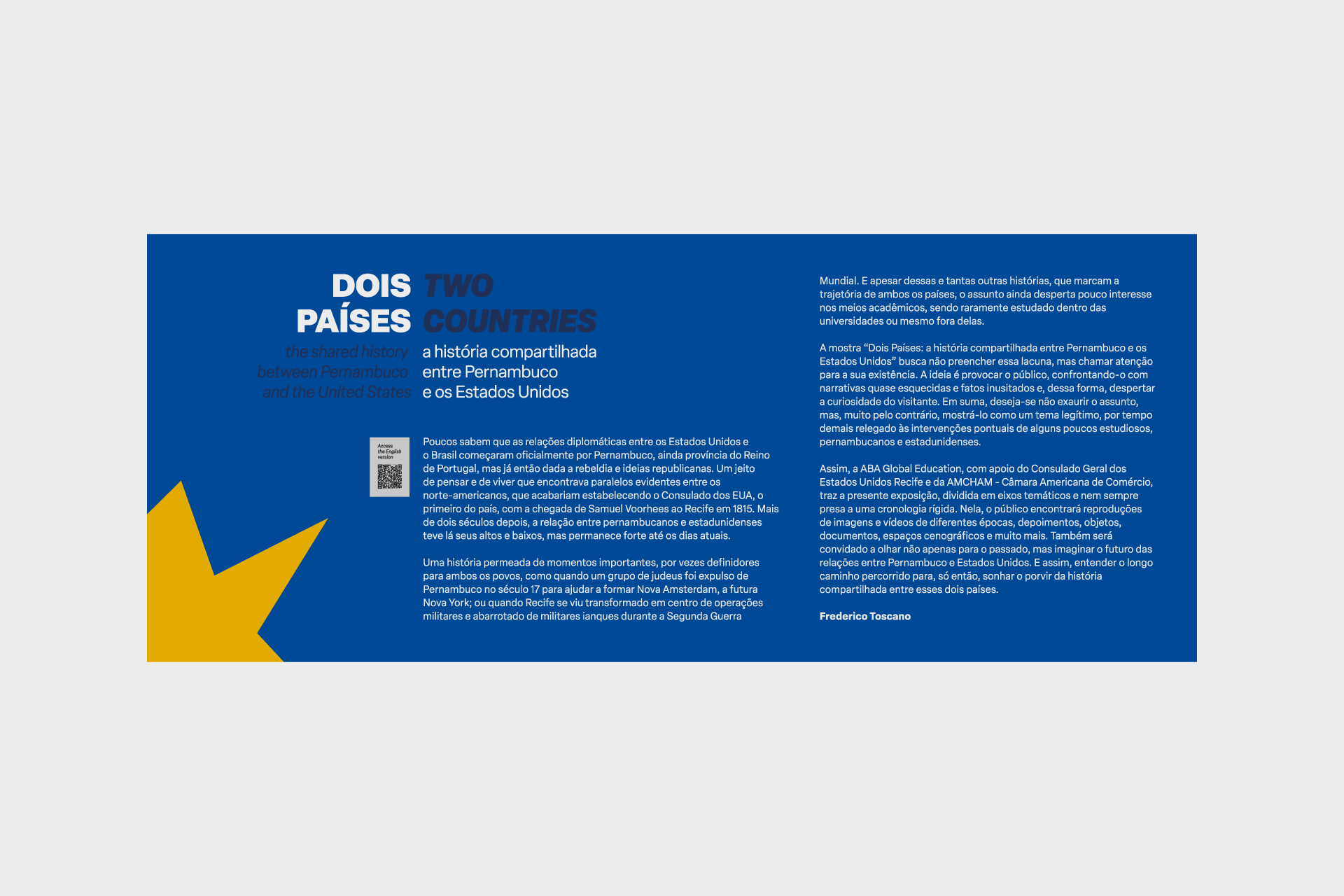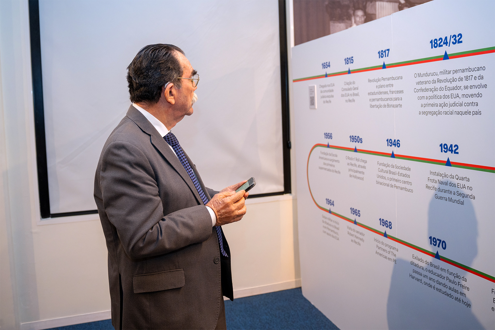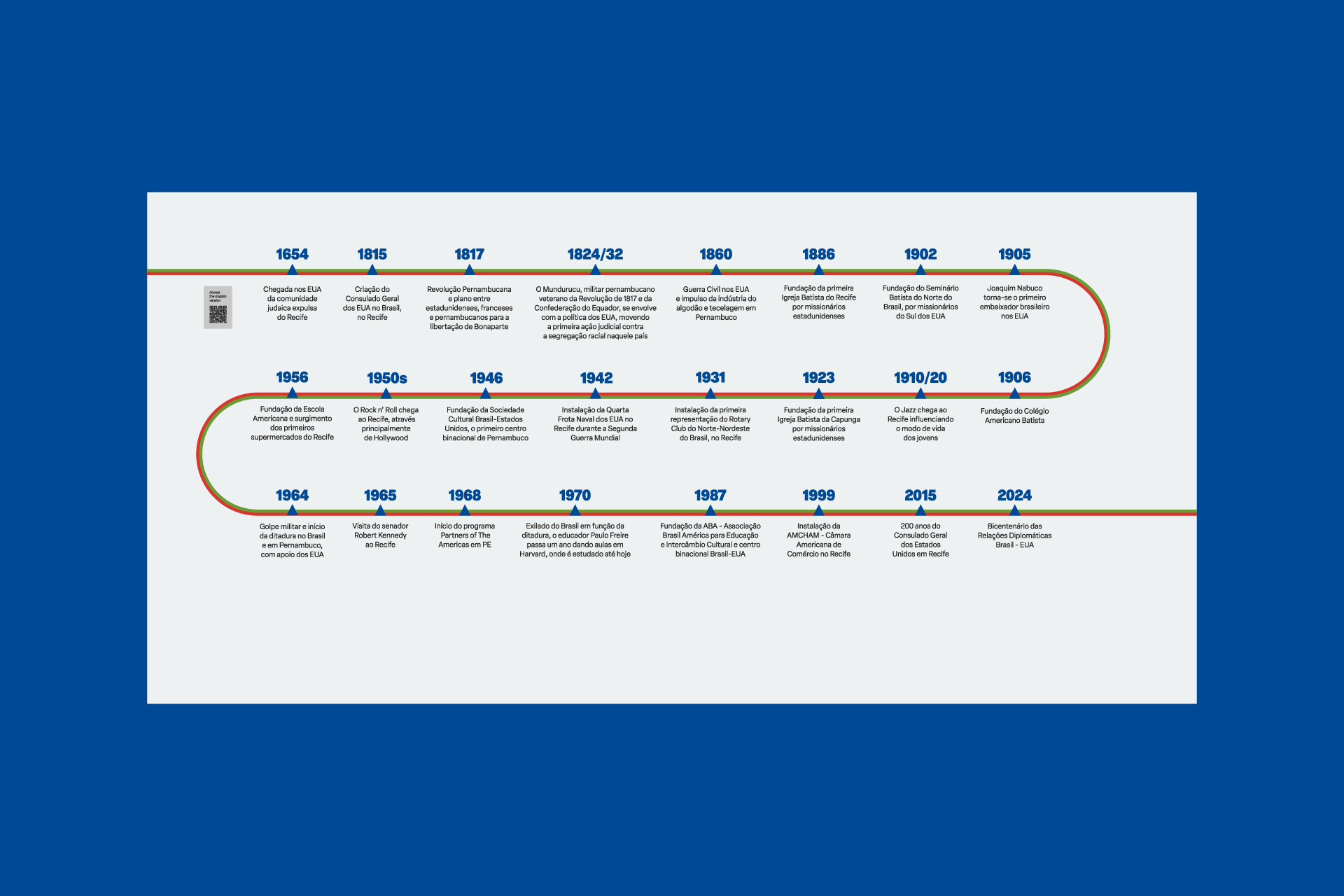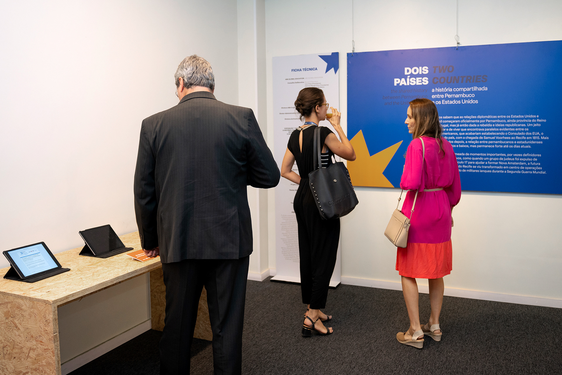 Como parte das celebrações pelos 200 anos de relações diplomáticas entre Brasil e Estados Unidos, a ABA Global Education, com apoio do Consulado Geral dos EUA no Recife e da AMCHAM, promoveu a exposição “Dois países: a história compartilhada entre Pernambuco e os Estados Unidos”. Utilizando um tom bairrista, a proposta da exposição foi reconhecer o “país Pernambuco” através de sua relação histórica com os EUA, traçando uma linha do tempo que vai desde a migração de uma colônia de judeus recifenses para Nova York, no século 17, até os dias atuais, convidando o público a imaginar o futuro dessa conexão.
