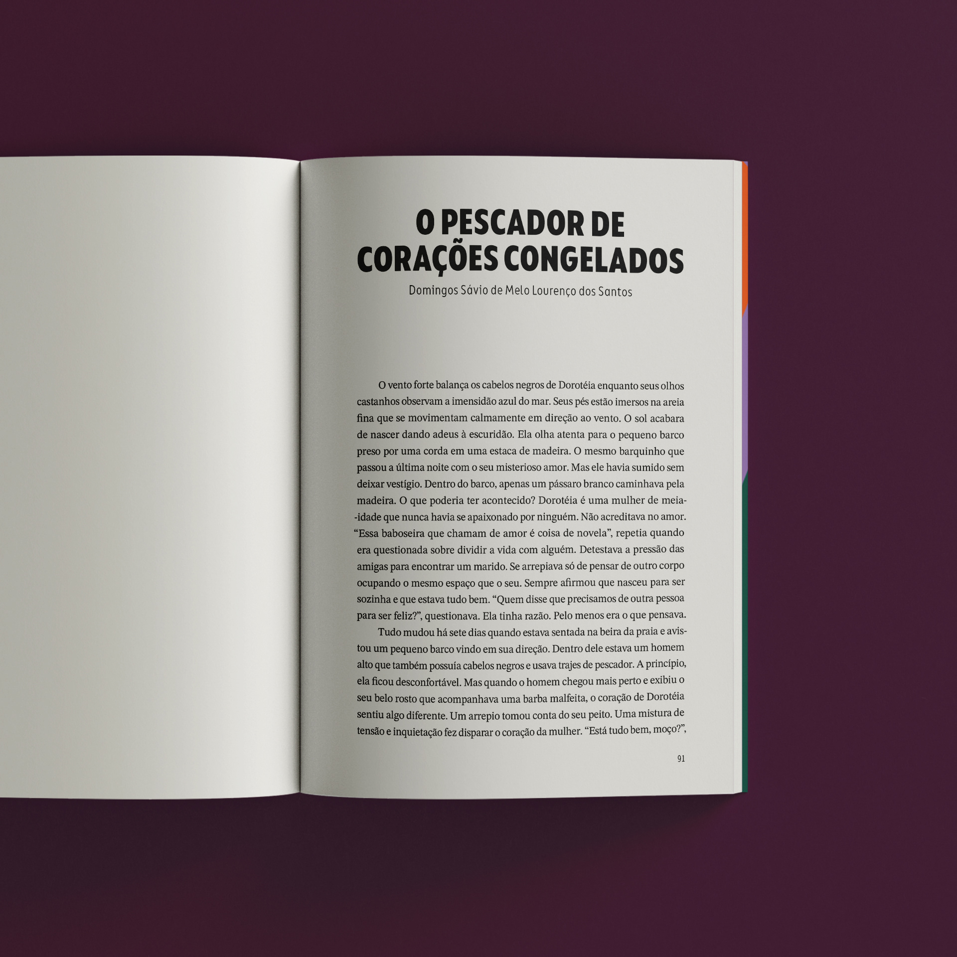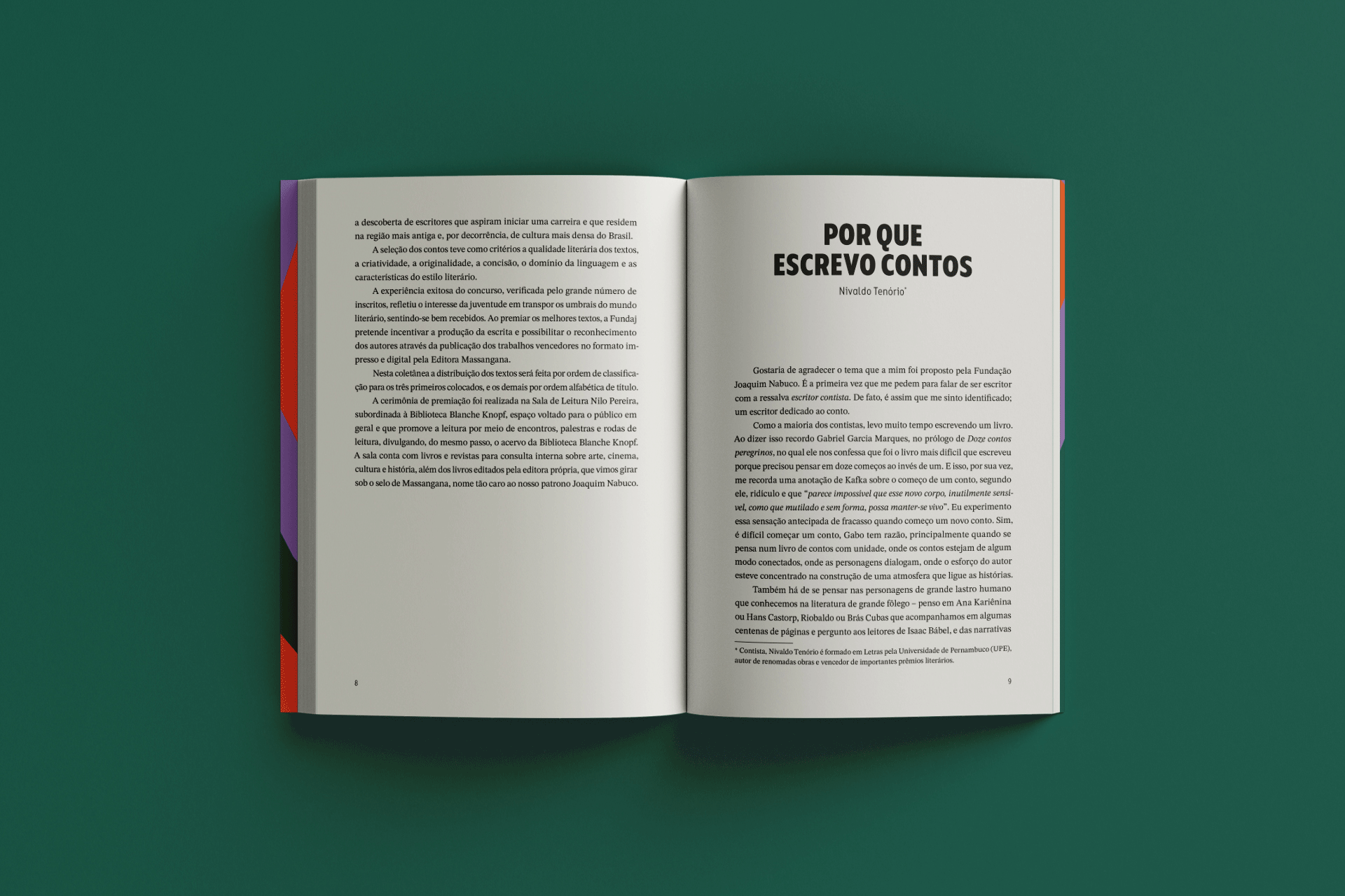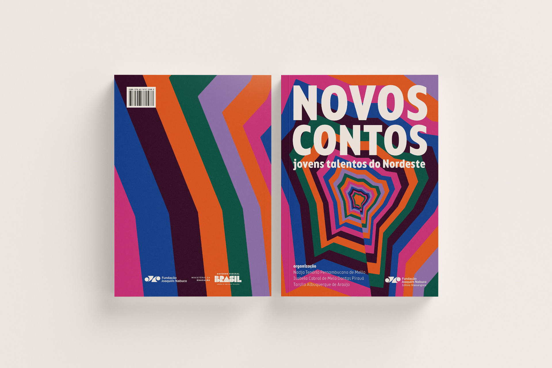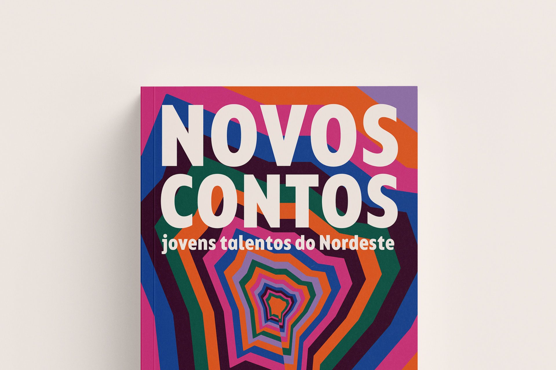 "Novos contos: jovens talentos do Nordeste" é uma publicação que reúne os contos premiados no Concurso Literário Novos Escritores, promovido pela Biblioteca Blanche Knopf da Fundação Joaquim Nabuco. Direcionada a um público jovem – assim como os(as) autores(as) dos contos da obra –, sua proposta visual se estrutura a partir do efeito ótico construído com uma síntese do mapa do Nordeste. A profundidade e o movimento sugeridos estabelecem um paralelo com a reverberação dessas autorias, reforçando a diversidade de ideias e as potencialidades da literatura.